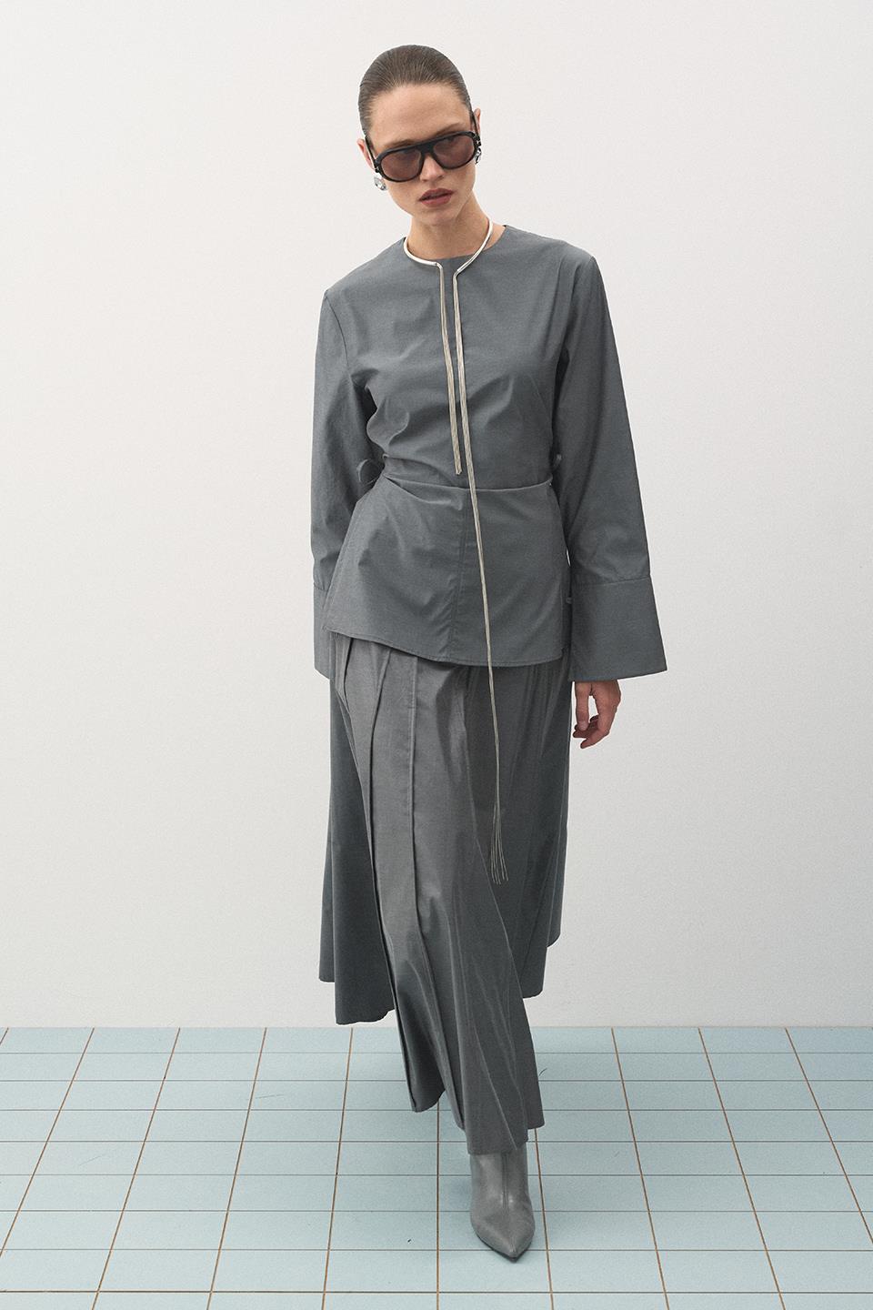 Keskin hatları ve belirgin dikiş detaylarıyla öne çıkan Dikiş Detaylı Denim Takım, klasik denim anlayışına sofistike bir yorum kazandırıyor. Gömleğin yakasındaki fiyonk formu, güçlü siluetin içinde zarif bir denge yaratıyor. Geniş paçalı pantolonun modern kesimi, formu tamamlayarak şehirli bir duruş sunuyor. Kontrast dikiş hatları, tasarıma mimari bir karakter kazandırırken, koyu denim tonu görünümü sade ama etkileyici hale getiriyor. Jolamier kadınının kendinden emin, ölçülü ve zamansız stilinin çağdaş bir yansıması.