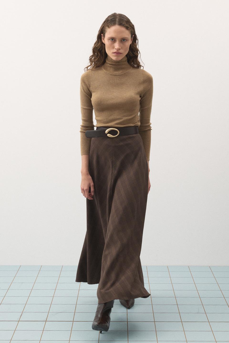 Klasik ekose deseninin nostaljik havası, modern kesimle buluşuyor. Kahve tonlarının dinginliğiyle öne çıkan Volanlı Etek, ince detayları ve zarif akışıyla günün her saatine uyum sağlıyor. Duru bir zarafet anlayışına sahip Jolamier kadını için tasarlandı: sade, güçlü ve zamansız.