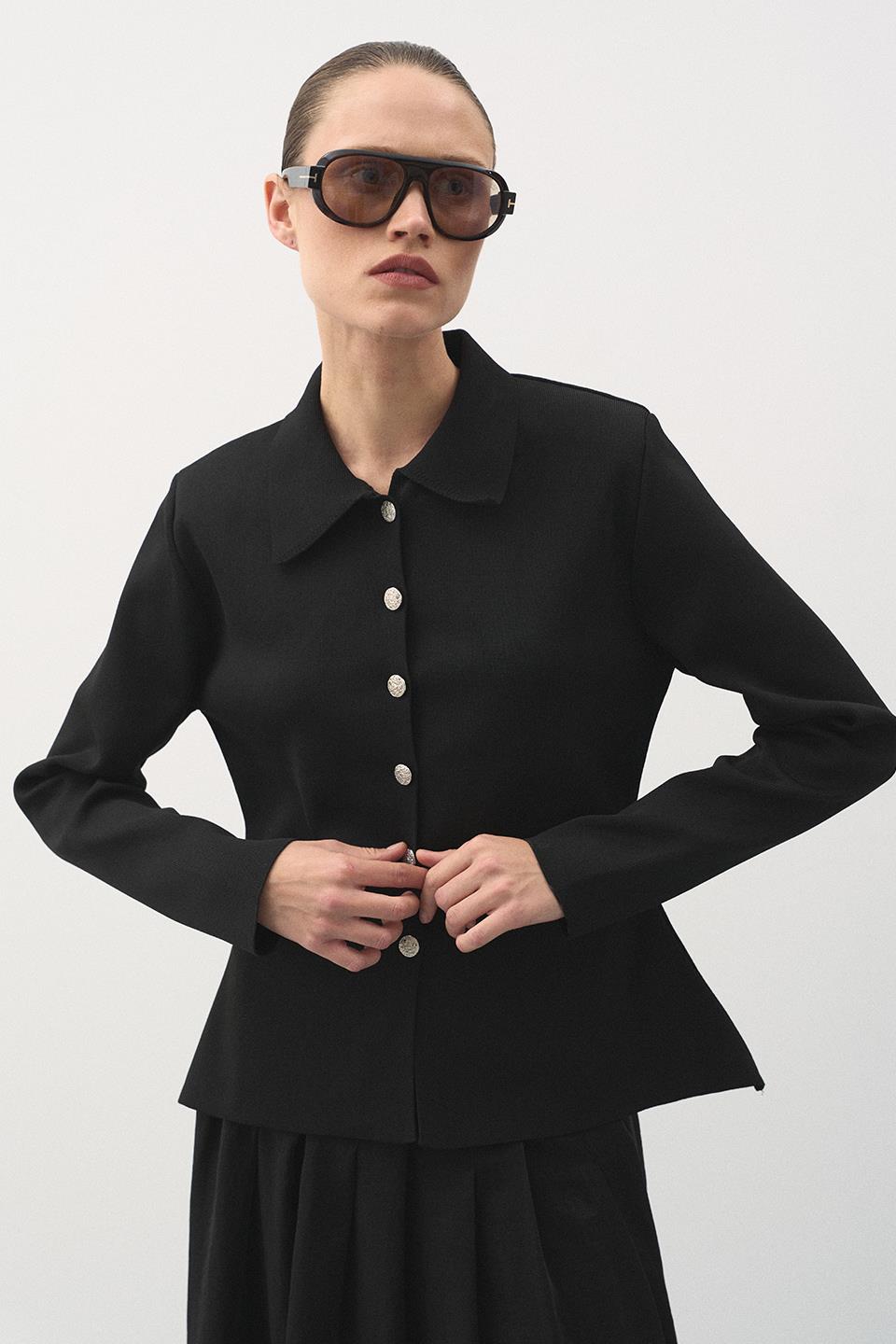 Metalik Düğmeli Fit Triko Hırka Siyah