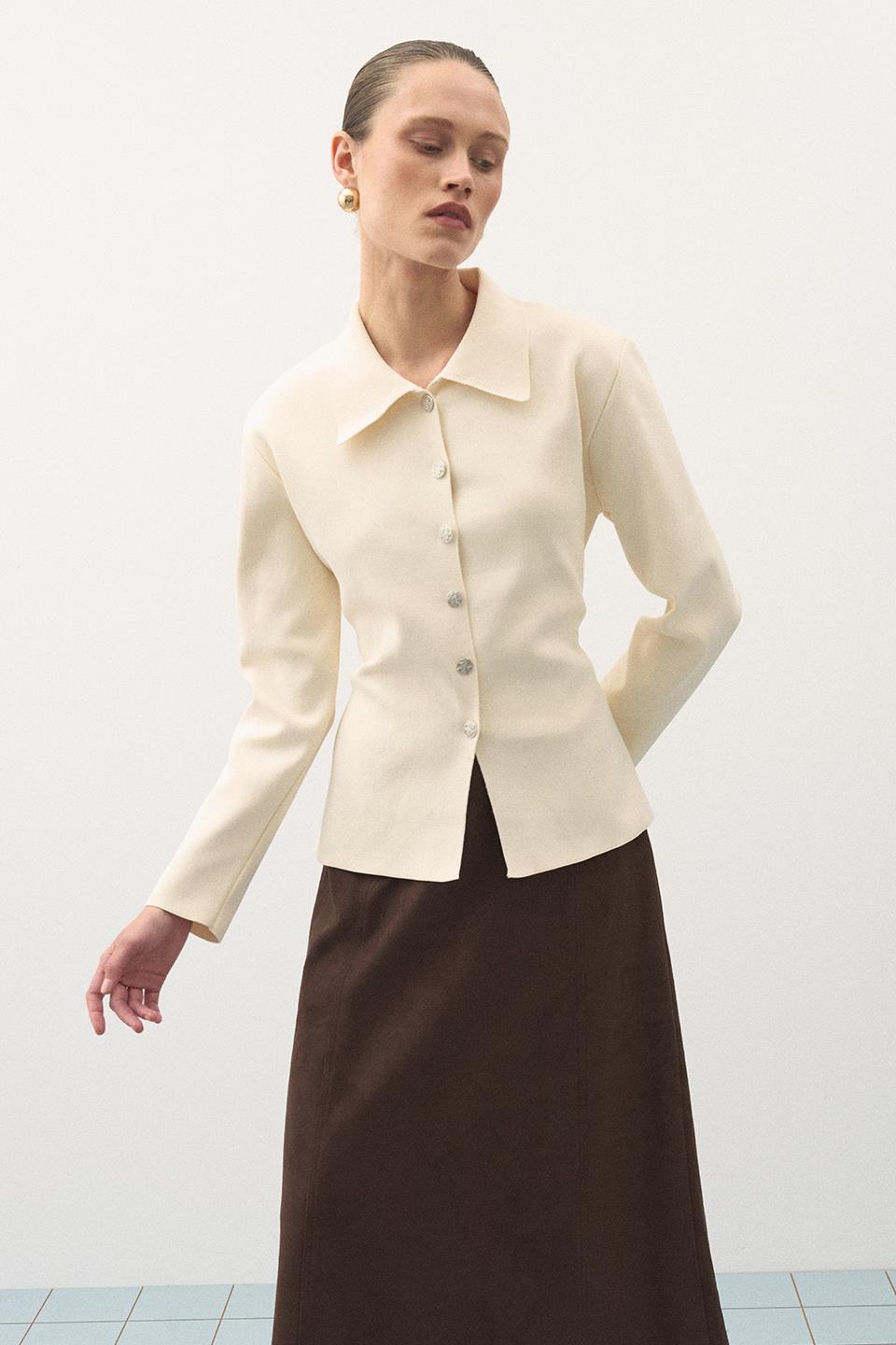 Minimal tasarımı, vücuda oturan kalıbı ve dikkat çekici metalik düğmeleriyle hem sofistike hem çağdaş bir duruş sergiler. Hafif dokulu triko kumaşıyla vücuda zarifçe otururken, gün boyu konfor sunar. Klasik yakası ve fit siluetiyle ofis stilinden akşam davetlerine kadar geniş bir kullanım alanı sunar. Açık ekru tonunun sade asaleti, modern şehir kadınının gardırobunda zamansız bir yer bulur. Etek, pantolon veya midi eteklerle kombinlenerek kusursuz bir denge yaratır — sade ama etkileyici bir duruş için ideal bir parça.