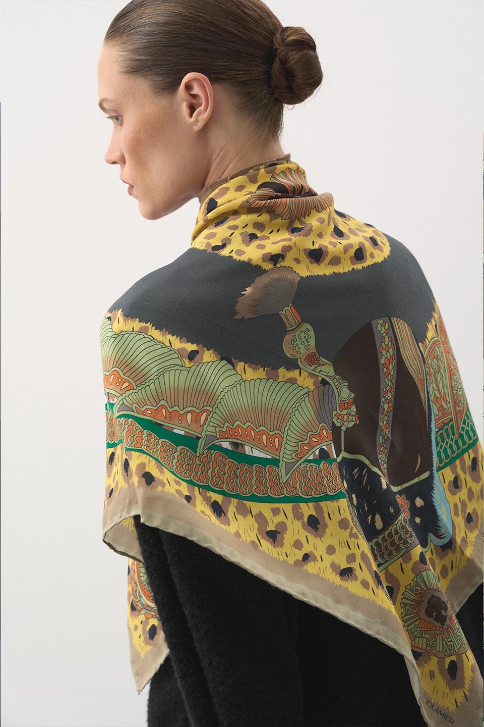 Gelenekten aldığı ilhamı modern bir sanatsal anlatıya dönüştüren bu desen, Jolamier’in özünü yansıtıyor. Kültürel semboller, zarif çizgiler ve cesur renk geçişleriyle birleşerek hem güçlü hem de şiirsel bir ifade oluşturuyor. Her detayında geçmişe saygı, bugüne zarafet taşıyan bu eşarp; sezonun en özgün hikayesini stiline dokunduran parça.