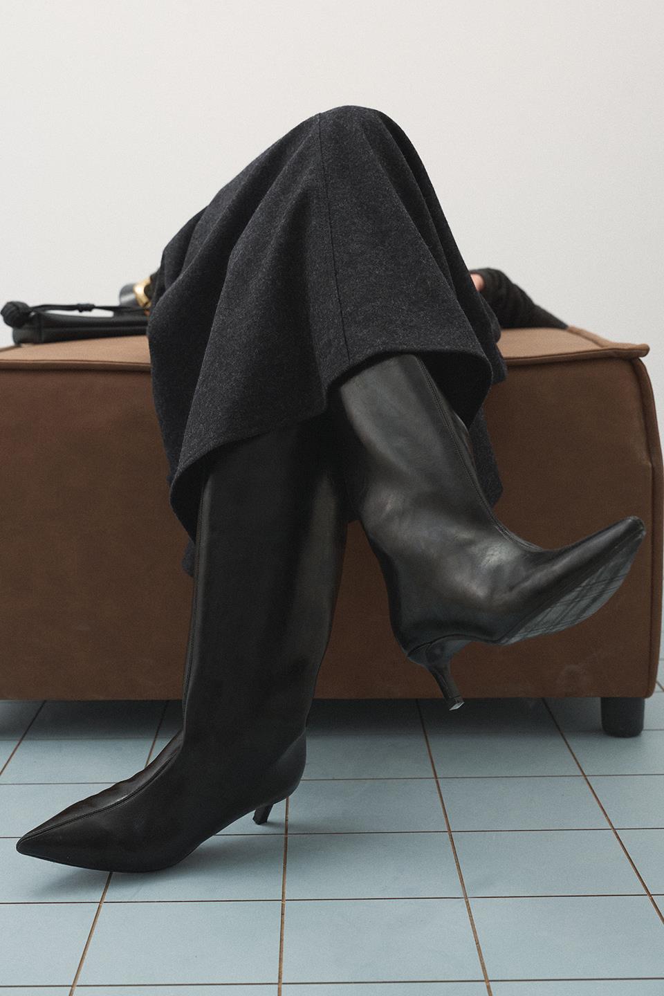 Koleksiyonun güçlü siluetlerinden biri olan Topuklu Çizme, minimal tasarım çizgisini iddialı bir duruşla buluşturuyor. Yumuşak formlu yapısı ve bacağı saran esnek tasarımı sayesinde feminen bir siluet sunarken, ince topuğu ve sivri burun formu ile modern şehir stiline zarif bir dokunuş katıyor. Nötr tonu sayesinde hem gündüz hem gece görünümlerine kolayca uyum sağlar. Zarif, sofistike ve dikkat çekici bir tamamlayıcı arayanlar için tasarlandı.