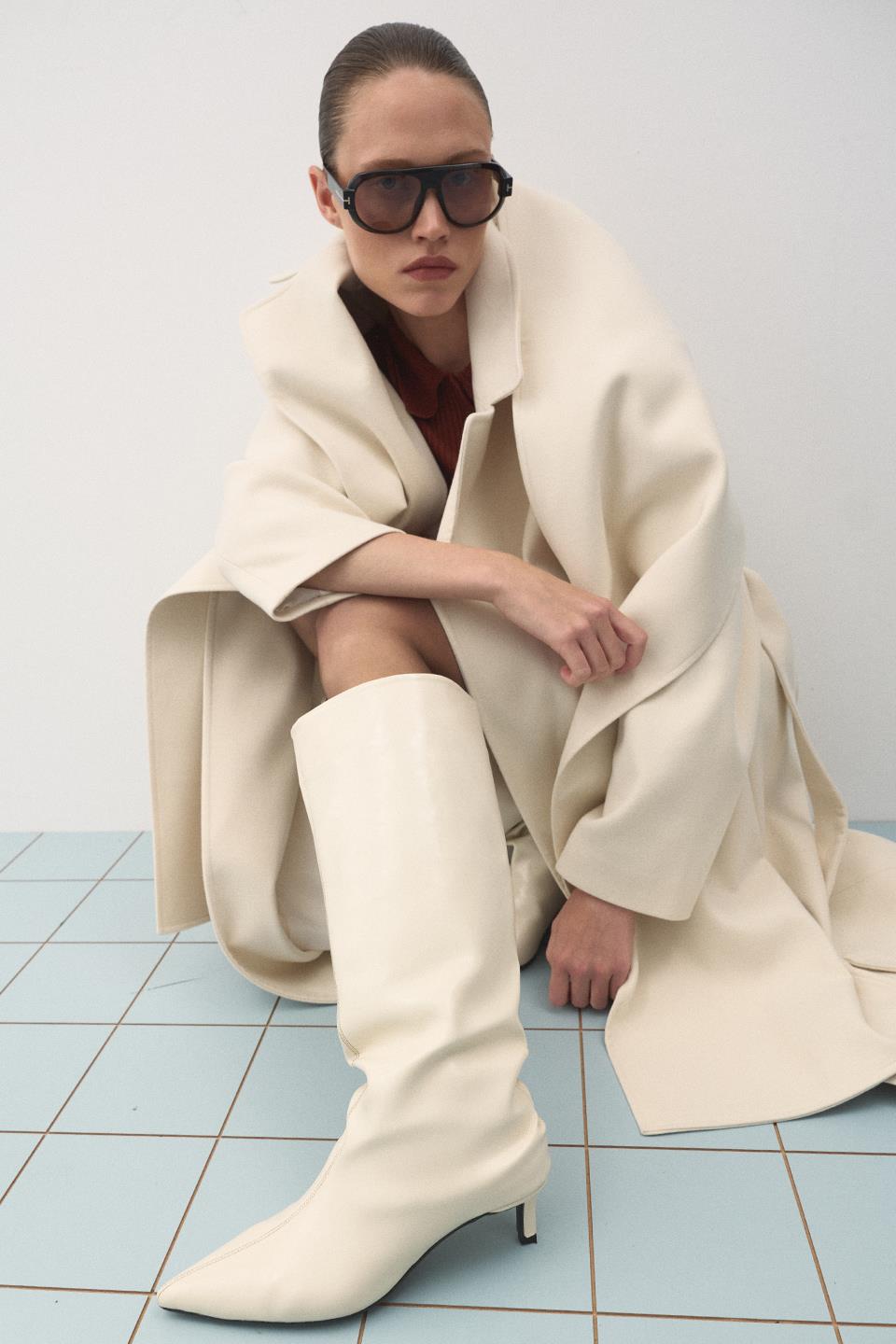 Koleksiyonun güçlü siluetlerinden biri olan Topuklu Çizme, minimal tasarım çizgisini iddialı bir duruşla buluşturuyor. Yumuşak formlu yapısı ve bacağı saran esnek tasarımı sayesinde feminen bir siluet sunarken, ince topuğu ve sivri burun formu ile modern şehir stiline zarif bir dokunuş katıyor. Nötr tonu sayesinde hem gündüz hem gece görünümlerine kolayca uyum sağlar. Zarif, sofistike ve dikkat çekici bir tamamlayıcı arayanlar için tasarlandı.