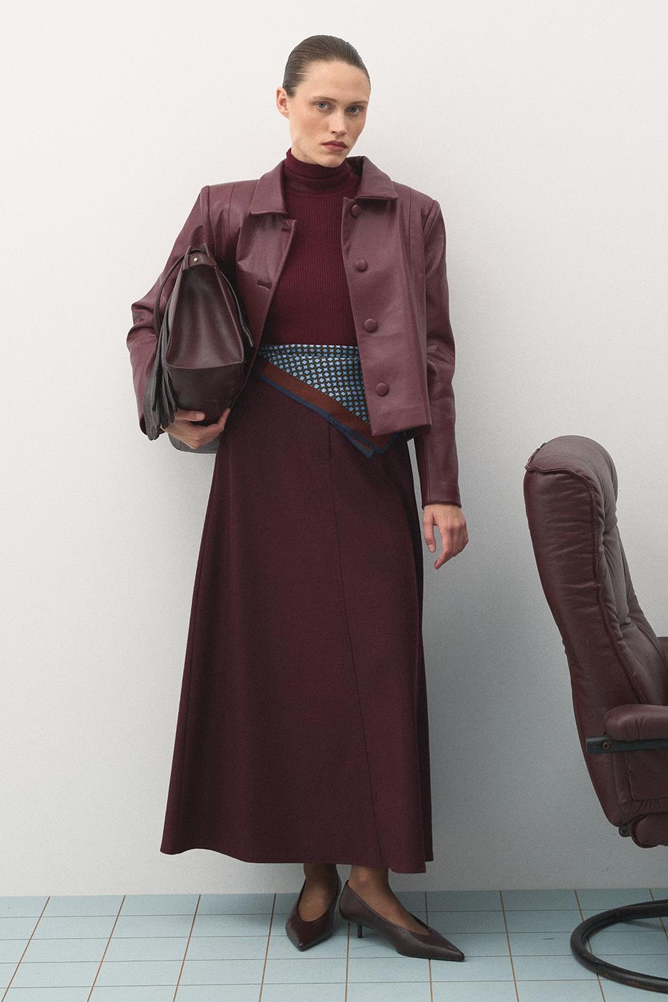 Yüksek bel formu ve zarif dökümüyle dikkat çeken Uzun A Kesim Etek, sade ama güçlü bir siluet yaratır. Yumuşak dokulu kumaşı her adımda akışkan bir hareket sağlarken, A form kesimi vücudu zarifçe dengeleyerek modern bir görünüm kazandırır.