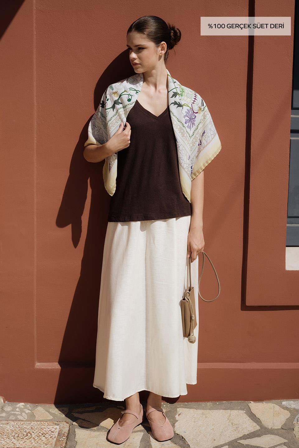 Koleksiyonun öne çıkan parçalarından biri olan bu gerçek süet Mary Jane stili ayakkabı, nostaljik zarafeti modern detaylarla buluşturuyor. Küt burun formu ve bilekten tokalı kayışıyla hem şık hem de konforlu bir kullanım sunar. Günlük stilinize canlılık katarken özel günlerde de iddialı bir tamamlayıcı olur.